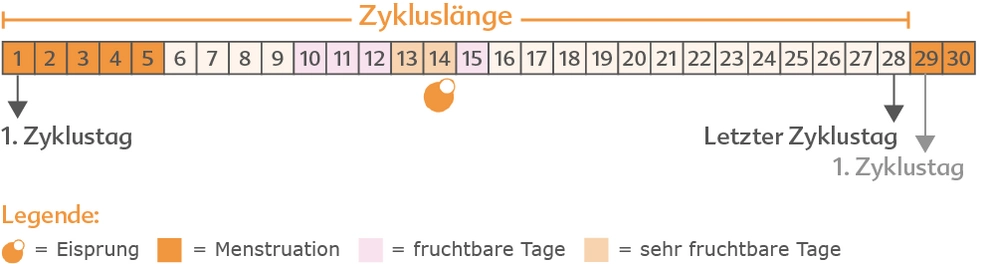 Der Menstruationszyklus ist hinsichtlich Dauer und Verlauf so individuell wie jede Frau selbst. Um Ihre Zykluslänge zu bestimmen, ermitteln Sie die Tage zwischen dem 1. Tag der Menstruation und dem letzten Tag vor dem Einsetzen der nächsten Menstruation. In den meisten Fällen dauert ein Zyklus 23 - 35 Tage. Die Zyklusdauer variiert dabei nicht nur von Frau zu Frau, sondern kann auch von Zyklus zu Zyklus schwanken.